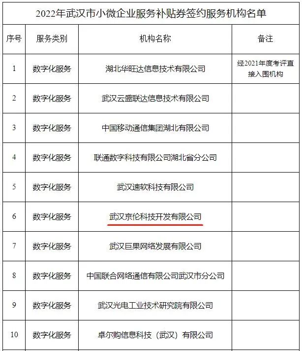 ? ? ? ?经过评审公示,武汉京伦科技开发有限公司入选为官方指定的2022年度武汉市小微企业“数字化服务”类别的签约服务机构,持续助力武汉市小微企业!
