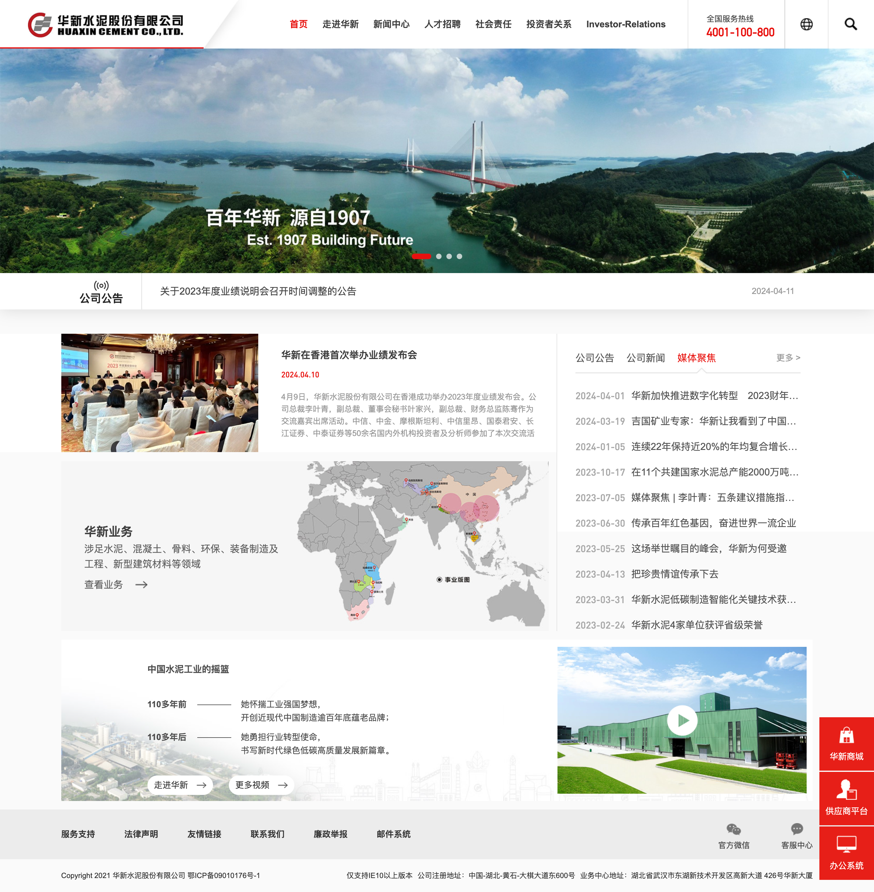华新水泥股份有限公司始创于1907年,被誉为中国水泥工业的摇篮,110多年来为国家和地方经济社会发展作出了突出贡献。华新水泥企业资信为“AAA”级,“华新堡垒”为中国驰名商标。北京上世纪50年代的十大建筑、北京亚运村、葛洲坝、京珠高速公路,长江中下游数十座公路和铁路大桥、举世瞩目的三峡工程等国家重点工程,均选用华新水泥。