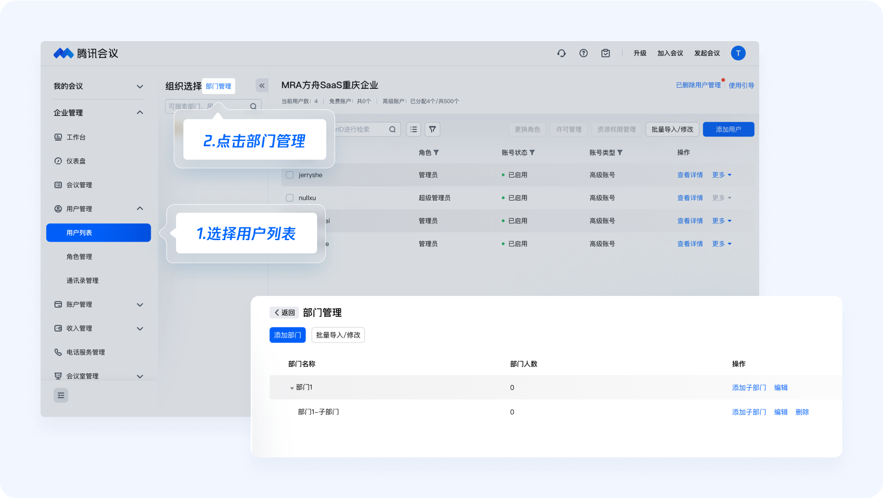 ● 管理员:管理员拥有访问和管理企业账户的广泛权限,能够辅助超级管理员对企业组织会议资源、成员进行管理。