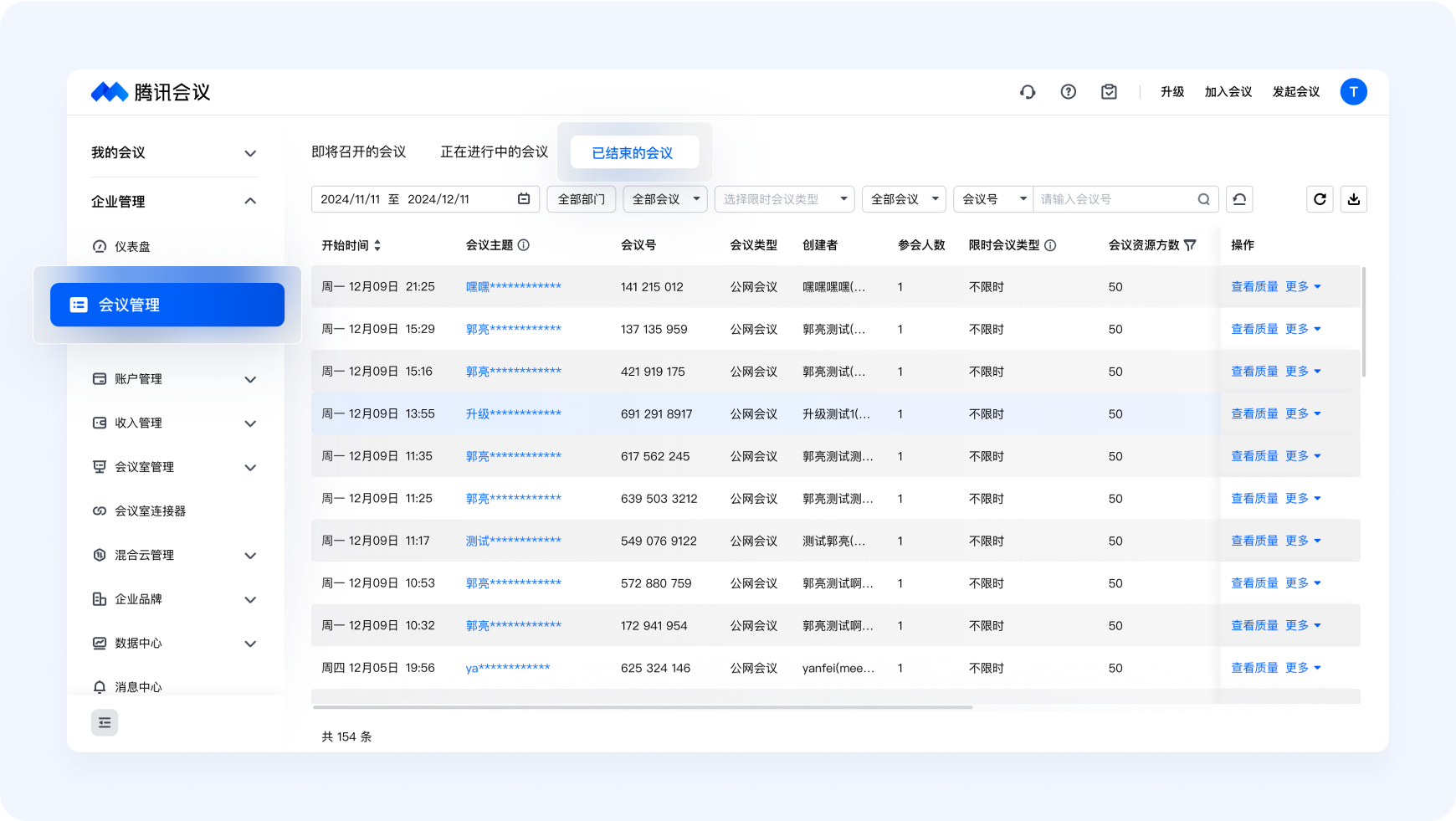 在企业管理后台-【会议管理】中,作为企业管理员,您可以查询到企业当前即将召开、正在进行中、已结束的会议,并对这些会议进行一定管理。
