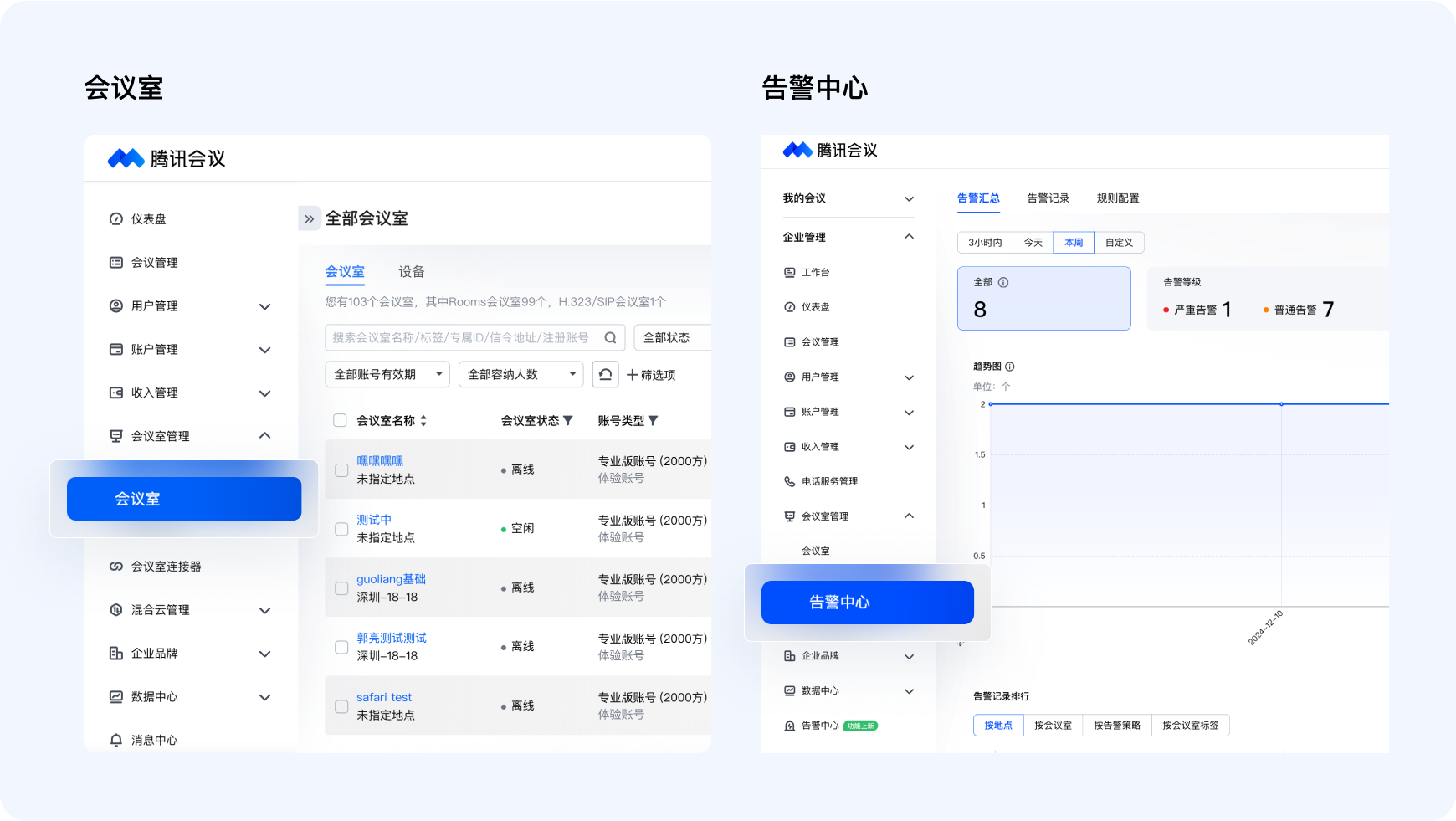 在企业管理后台-【会议室管理】中,您可以添加本地会议室,并配置Rooms账号,以便实现统一管理。同时,企管后台为您提供告警中心,按需配置不同的规则后,在会议室异常情况下,会向您发出告警,助力您快速解决问题。
