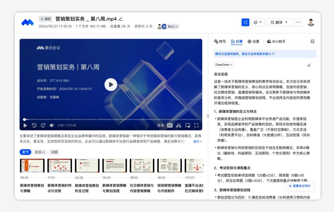 ?? 让「智能录制」帮你存档沉淀,音频、视频、共享屏幕、转写文本均可单独留存,录制结束后生成安全的加密链接,智能总结出章节、话题、发言人,清晰看到核心内容。