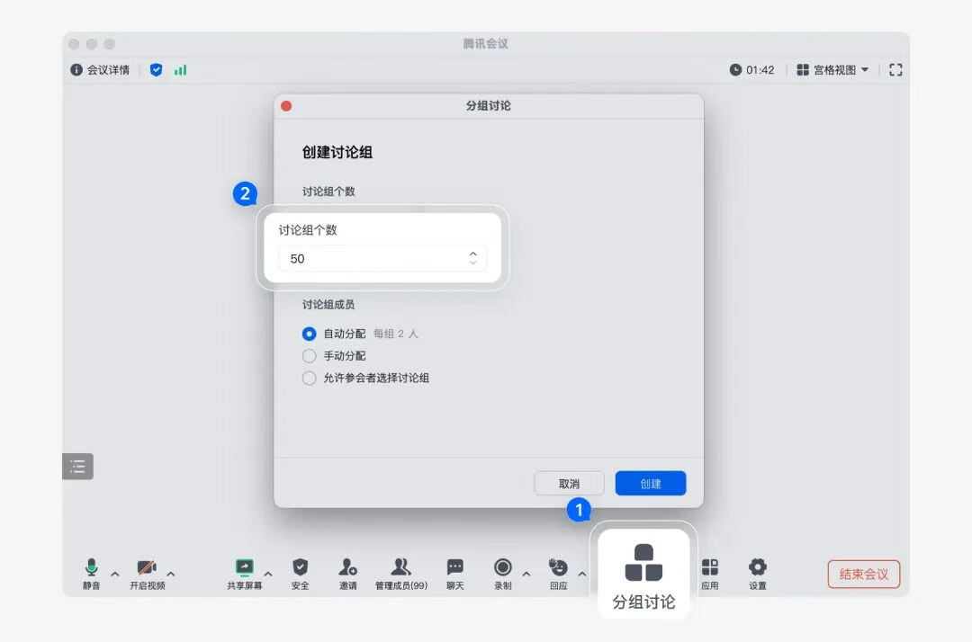 商业版支持最高50个分组讨论、专业版支持最高2个,年底业绩冲刺培训会里参会者不用换会议号,原会议号里轻松切小组,培训也能开得像教室分桌一样有互动感。
