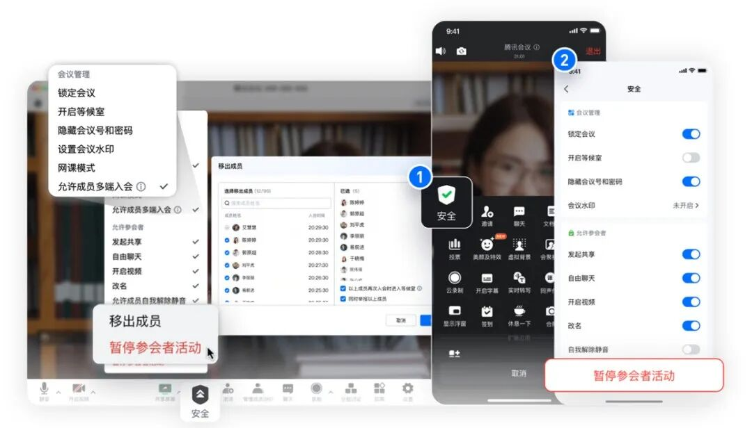 同时,还为您提供包括会议密码、等候室、锁定会议、一键全体静音、共享屏幕等权限管控,让会议主持人和联席主持人一块把控好会议秩序,防止重要内容泄露。如遇紧急情况,还可选择“一键暂停参会者活动”,马上恢复会议秩序。