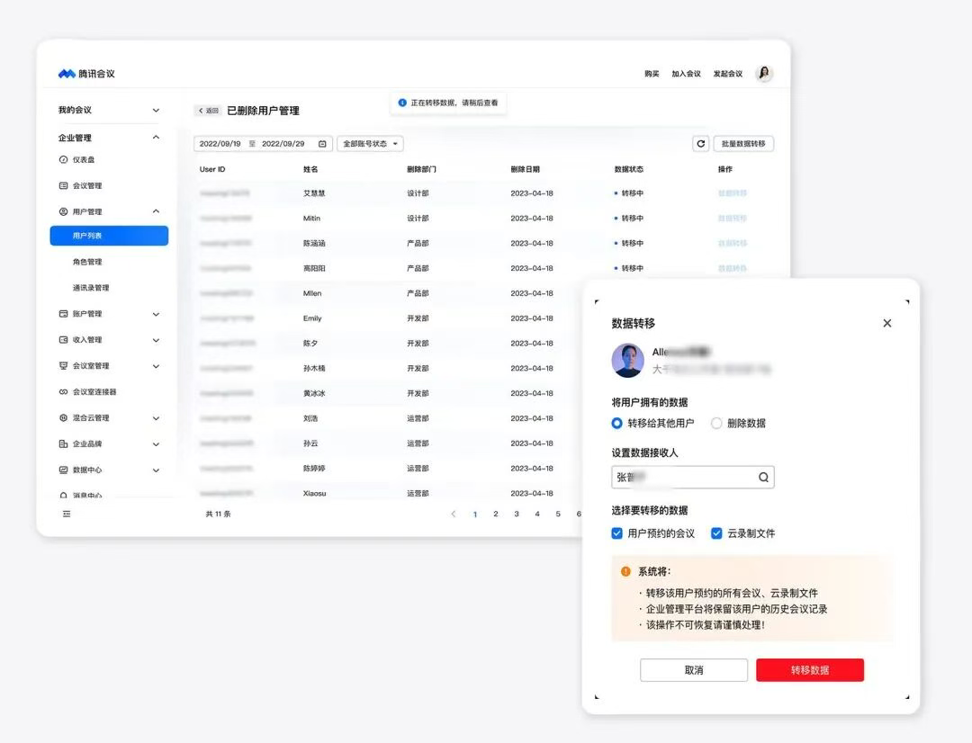 现在,前往活动页下单,统一购买和分配给员工的商业版高级账号归属您的企业所有,可重新分配给其他企业成员,并且支持对离职员工账号下的会议资产(待开会议、云录制等)进行删除或者转移给其他同事,高效交接,保障会议资产的安全流转。